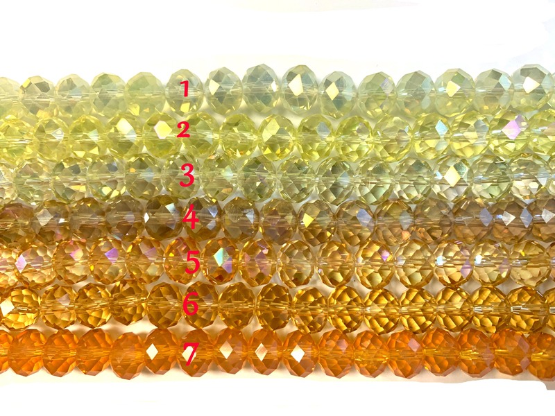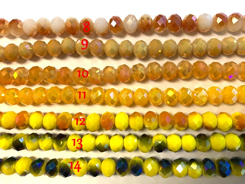 #1 – Light Opal Yellow, #10 – Mustard, #11 – Yellow, #12 – Yellow with Gold, #13 – Yellow w Purple, #14 – Yellow with Blue, #2 – Yellow, #3 – Light Yellow, #4 – Light Colorado, #5 – Colorado Topaz, #6 – Topaz, #7 – Opal Orange, #8 – White with Orange, #9 – Light Mustard
