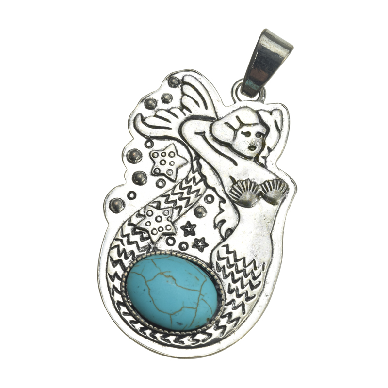 63.5x39mm Antique Silver Green Howlite Turquoise Lead Free Pewter Mermaid Pendant(B71153) quantity