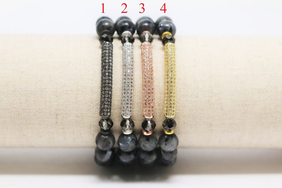 8mm Round Handmade Jasper With CZ Tube and 4x3 Hematite Gemstone Stretchy Bracelet (7.5 Inches) quantity