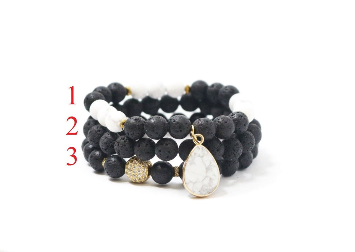 8mm Round Handmade Stretchy Lava Rock and White Howlite ,Oil Diffuser Bracelets, Healing Bracelets (Set of 3 or Individual) (7.5 inches) quantity