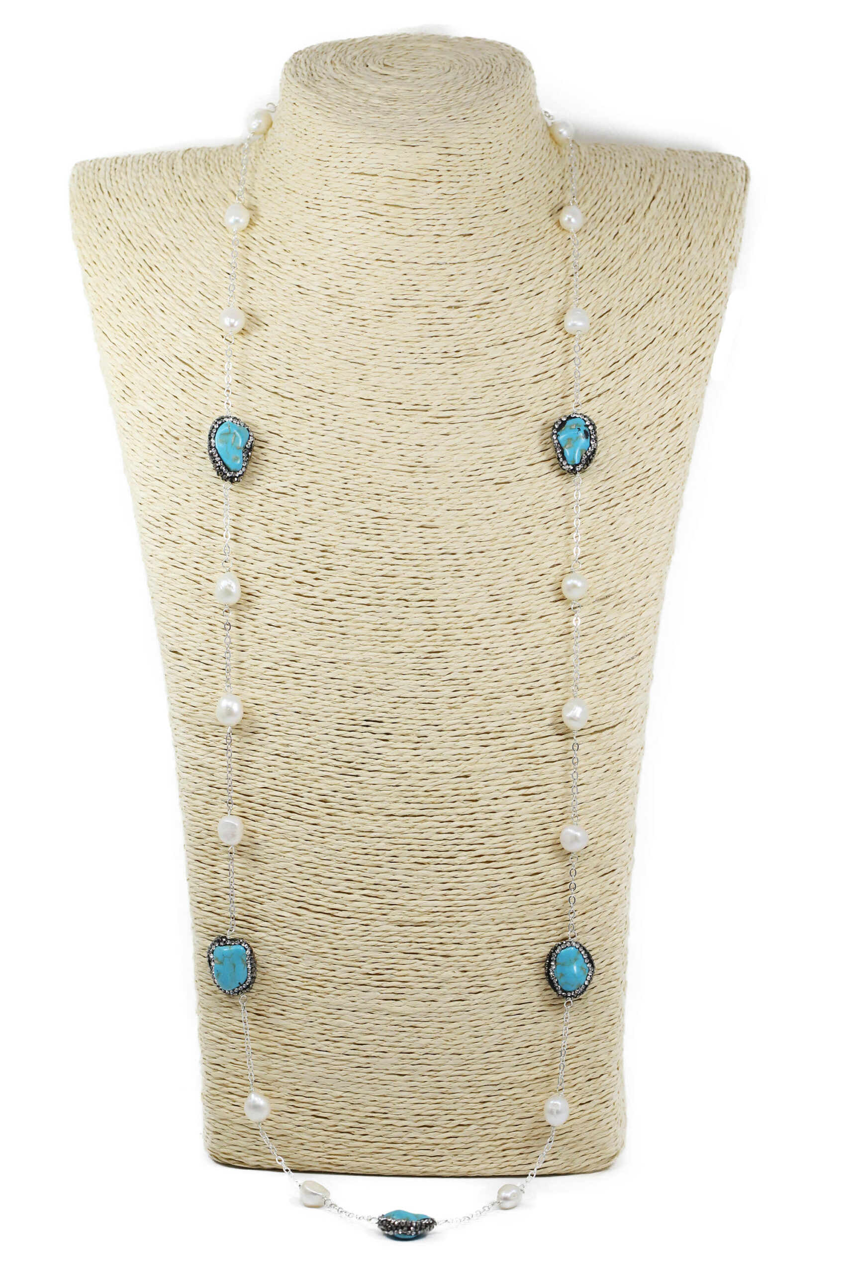 Handmade 36 Inches Long Fresh Water Pearl with Pave Rhinestone Turquoise Link Necklace