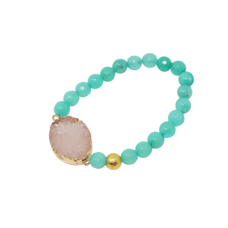 Jade with a Druzy Link and Brush Gold Spacer Round Bead Bracelet