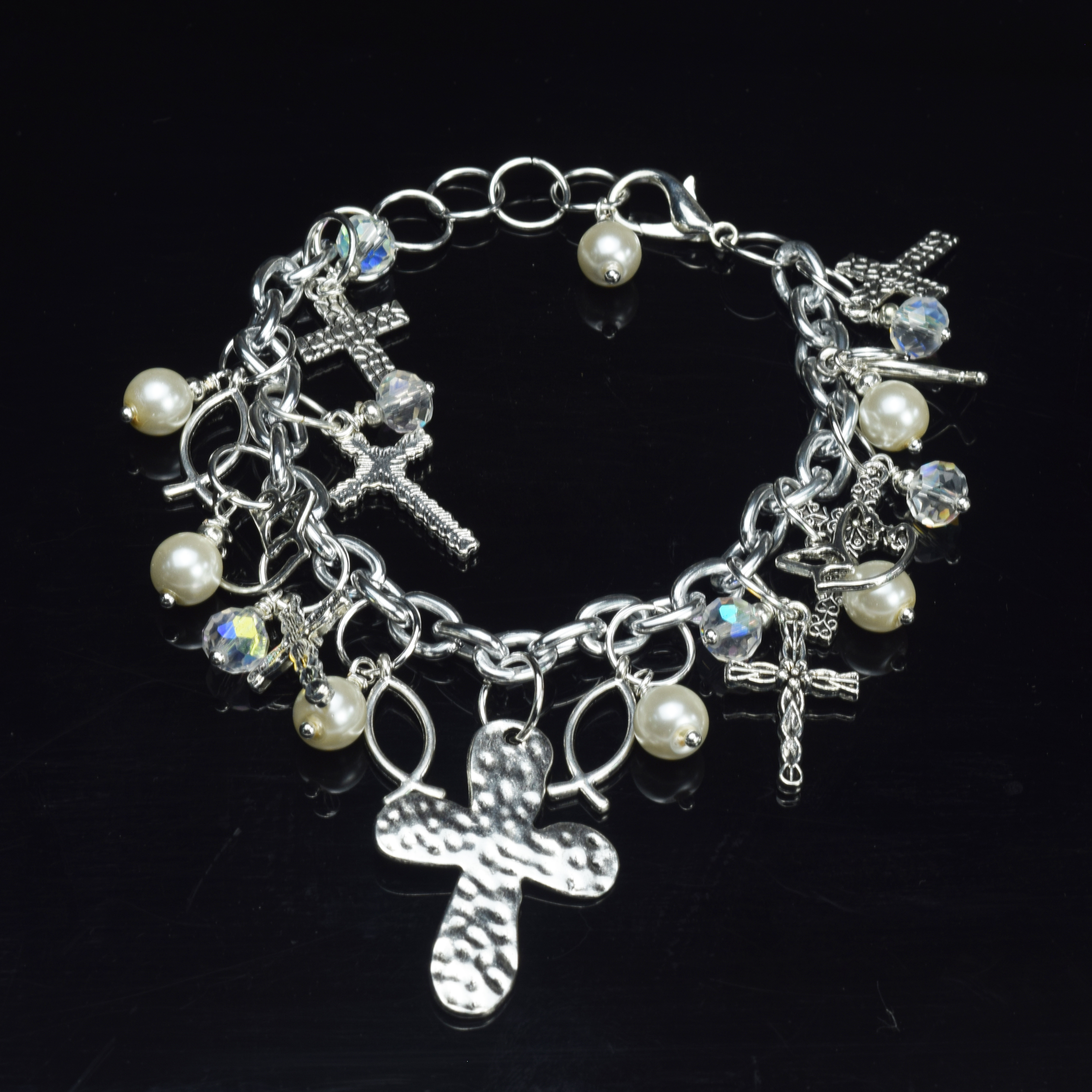 Lovely bead Charm Bracelet with Pewter Charms and Crystal Beads